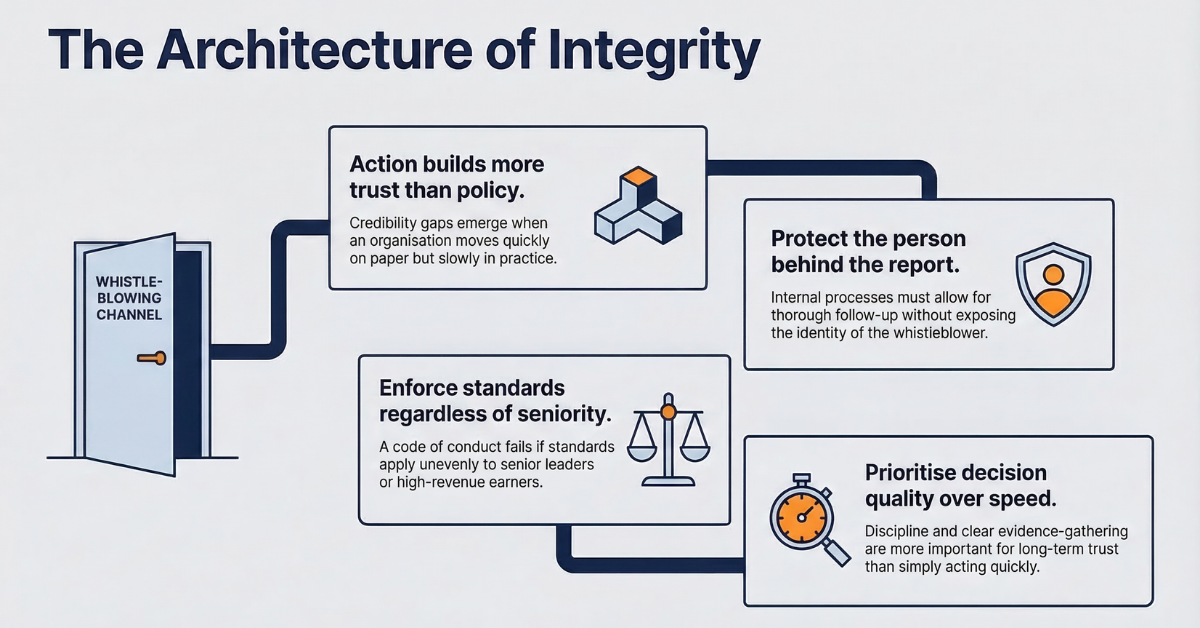 If someone raised a concern tomorrow, what would convince them your system will treat them fairly, protect them from blowback, and act consistently when the subject has power. If you can answer that in operational terms, you have something real. If you cannot, the next pressure test will not stay private for long.