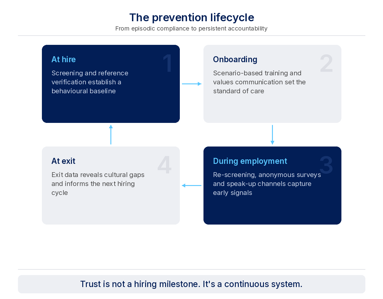 - During Employment: Continuous monitoring through re-screening, anonymous surveys and "speak-up" channels helps to capture early signals - such as uncomfortable dynamics or subtle patterns of exclusion - before they escalate into a crisis.