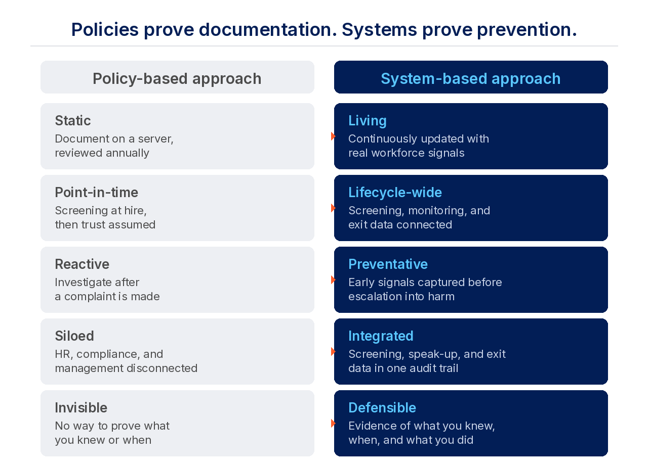 According to the EHRC, regulators no longer ask whether leaders have a policy. They ask, "How do you know your workplace is safe?" The difference between these questions reveals the gap between documentation and prevention. One requires a static file - the other a live integrity system that creates continuous visibility into what's happening across your workforce.