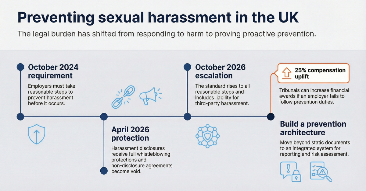 While most UK employers recognise the baseline changes introduced in October 2024, fewer are prepared for the escalating compliance bar set for 2026. The UK regulatory landscape is now shifting through three critical milestones, each one demanding greater transparency and more robust infrastructure, moving the standard from simple policy-writing to demonstrable, systemic prevention.