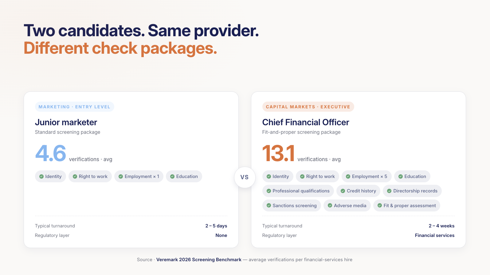 Veremark's 2026 Screening Benchmark put the average financial services hire at 4.6 verifications per check, with capital markets roles averaging 13.1. Healthcare, government, and roles working with vulnerable people sit on similar curves, shaped by the rules and risks of those sectors.