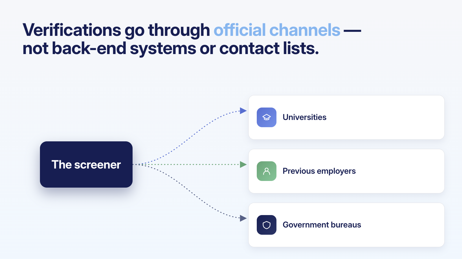 The screening provider has its own process. We assess what's been submitted, route each verification to the right place, follow up where needed, and handle anything ambiguous. Each verifier on the other end has their own process too. Universities have dedicated verification teams running on their own queues. Employers' HR teams take requests alongside their day-to-day work. Government bodies and police agencies have their own backlogs.