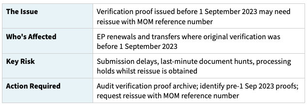 - Verification proof issued before 1 September 2023 may need reissue with MOM verification reference number