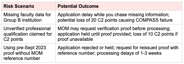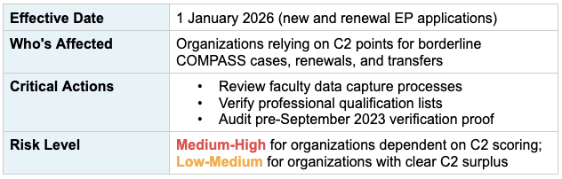 From 1 January 2026, three changes to MOM's education verification requirements will affect how HR teams score COMPASS C2 points and whether borderline EP applications succeed or fail. With the November 2025 list updates, the stakes are particularly high for organisations that rely on C2 points to meet COMPASS thresholds, or where faculty-specific qualifications can determine approval or rejection.