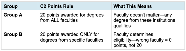 If you select a faculty that is not listed as eligible for that Group B institution, the candidate will not receive the 20 C2 points. This could cause the application to fail if you were relying on those points to meet COMPASS thresholds. MOM may also request clarification or reject the application if the faculty-qualification mismatch is apparent. Always verify faculty eligibility before submission.