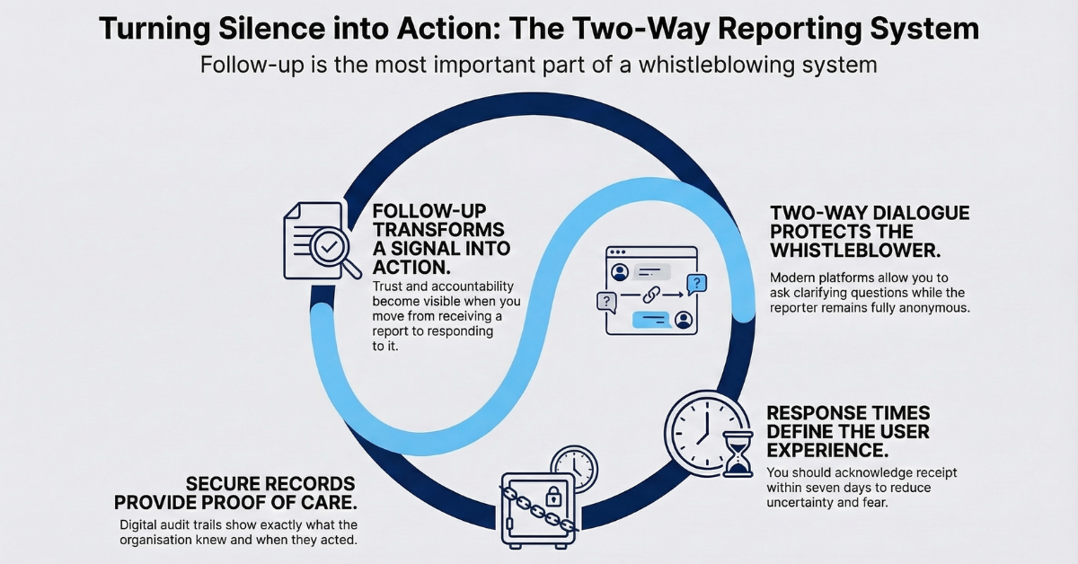 The EU framework is a useful reference point here. Guidance on the EU Whistleblower Directive includes acknowledging receipt in writing within 7 days and providing feedback within three months. These timelines are not only regulatory. They reflect how people experience risk. Long gaps make people assume the process has stalled, or that the organisation hopes the issue will fade.