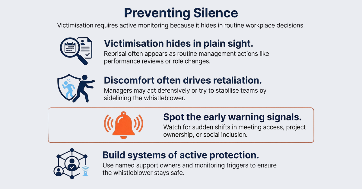 Victimisation sits in that messy middle. It doesn’t only harm the whistleblower. It damages signal quality across the organisation because people watch what happens. If they see the whistleblower sidelined, isolated, or quietly managed out, they don’t need a policy reminder. They learn the cost of speaking up.