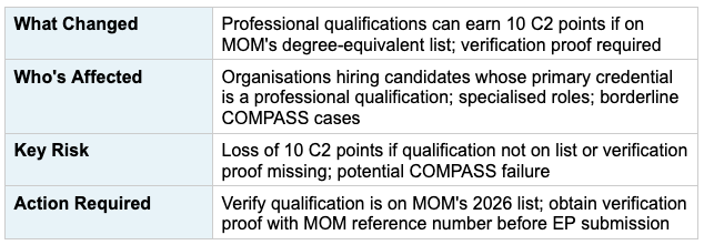 From 1 January 2026, MOM's updated COMPASS C2 list of degree-equivalent professional qualifications applies to new and renewal Employment Pass applications. For many teams, this is the part of C2 that gets overlooked. The reason is that professional qualifications often sit in a grey zone between "this looks credible" versus "this will earn points under COMPASS, and we can prove it in a way MOM accepts".