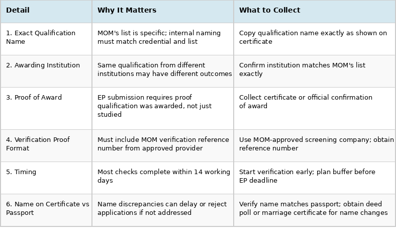 MOM's degree-equivalent list is specific. Your form needs to match what is on the candidate's credential and what is on MOM's list. Small variations in naming can create confusion during submission and result in rejections or lost points.