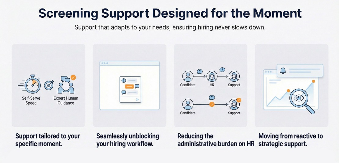 When support is designed around the moment, it reduces friction in small but meaningful ways. Clients can move between self-serve and human support without losing momentum. Candidates can complete steps with less uncertainty. Complex teams can spot issues earlier, and run screening with more control.
