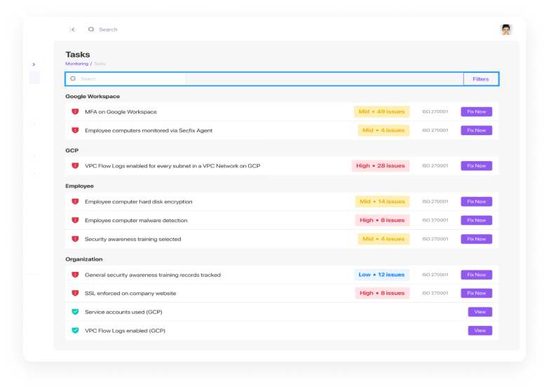Automatically generate a list of tasks to fulfil to become ISO 27001 compliant. Secfix security checks in your dashboard are based on the latest German-built technology - and operate in real-time. Whenever changes are made to your systems, your dashboard is automatically updated.